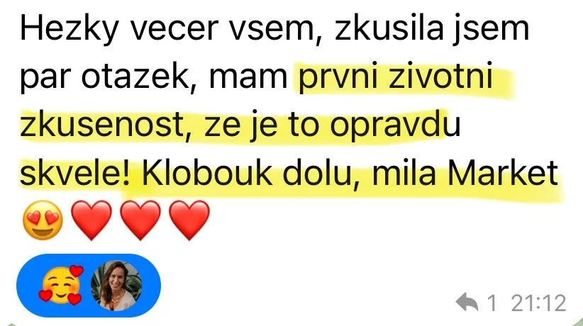 💡 Je natrénovaná na můj přístup. Nepřebírá generické fráze, ale vychází z desítek hodin mé práce s klientkami. Můj styl je empatický, chápající a zároveň věcný – přesně takovou odpověď od ní dostaneš. Jako bys psala mně.