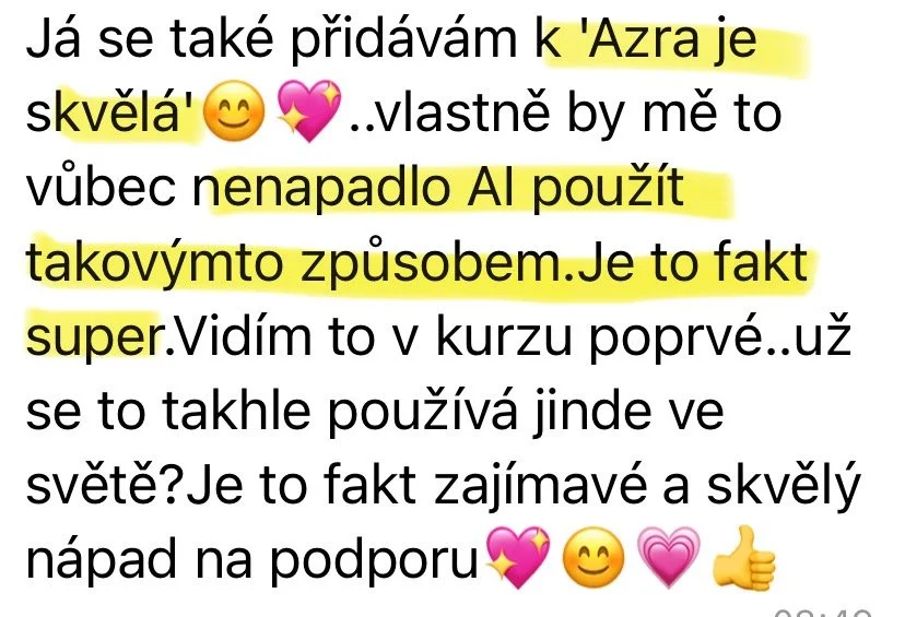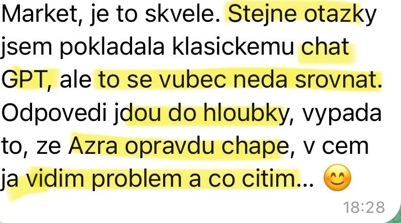 Nemusíš umět „AI prompty“ – s Azrou si prostě píšeš tak, jak mluvíš. Ptá se, doptává, drží prostor.